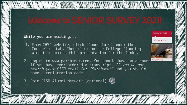 - From CHS' website, click "Counselors" under the Counseling tab. Then click on the College Planning widget to access this presentation for the links.
