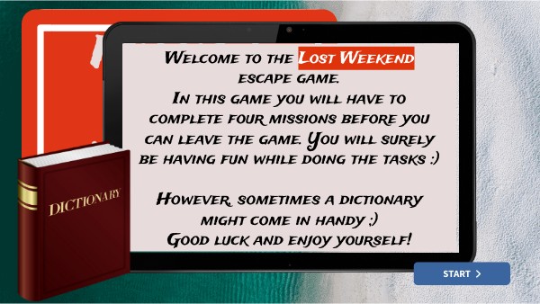 Welcome to the Lost Weekend escape game. In this game you will have to complete four missions before you can leave the game. You will surely be having fun while doing the tasks :) However, sometimes a dictionary might come in handy ;) Good luck and enjoy yourself!