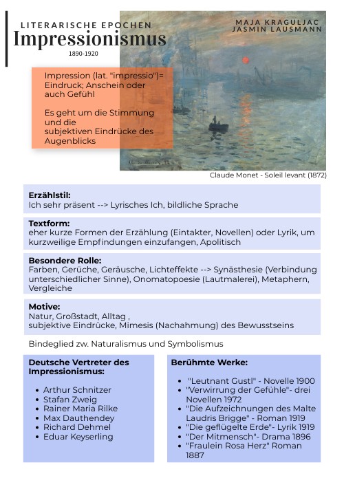 Erzählstil:Ich sehr präsent --> Lyrisches Ich, bildliche Sprache Textform: eher kurze Formen der Erzählung (Eintakter, Novellen) oder Lyrik, um kurzweilige Empfindungen einzufangen, Apolitisch Besondere Rolle: Farben, Gerüche, Geräusche, Lichteffekte --> Synästhesie (Verbindung unterschiedlicher Sinne), Onomatopoesie (Lautmalerei), Metaphern, VergleicheMotive: Natur, Großstadt, Alltag , subjektive Eindrücke, Mimesis (Nachahmung) des Bewusstseins Bindeglied zw. Naturalismus und Symbolismus