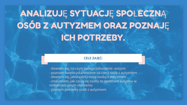 - dowiem się, na czym polega zaburzenie: autyzm - poznam święto ustanowione na rzecz osób z autyzmem - dowiem się, jakie zalety mają osoby z autyzmem - zrozumiem, jak czują się osoby ze spektrum autyzmu w nietolerancyjnym otoczeniu - poznam potrzeby osób z autyzmem