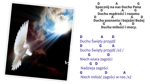 D A GSpocznij na nas Duchu Pana D A G Duchu mądrości i rozumu D A G D Duchu poznania i bojaźni Bożej G A D Duchu miłości i mocy.