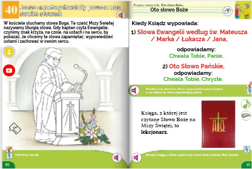 W kościele słuchamy słowa Boga. Tę część Mszy Świętej nazywamy liturgią słowa. Gdy kapłan czyta Ewangelię, czynimy znak krzyża, na czole, na ustach i na sercu, by pokazać, że chcemy te słowa zapamiętać, wypowiedzieć ustami i zachować w swoim sercu.