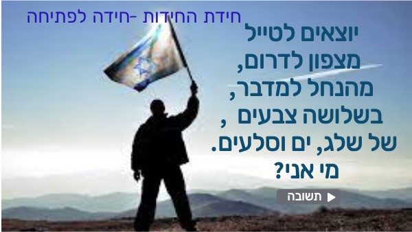 יוצאים לטייל ,מצפון לדרום ,מהנחל למדבר , בשלושה צבעים .של שלג, ים וסלעים ?מי אני