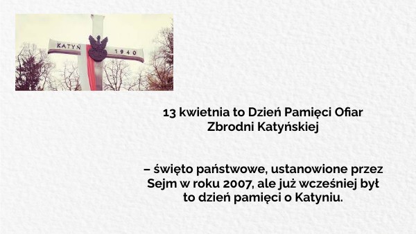 13 kwietnia to Dzień Pamięci Ofiar Zbrodni Katyńskiej – święto państwowe, ustanowione przez Sejm w roku 2007, ale już wcześniej był to dzień pamięci o Katyniu.