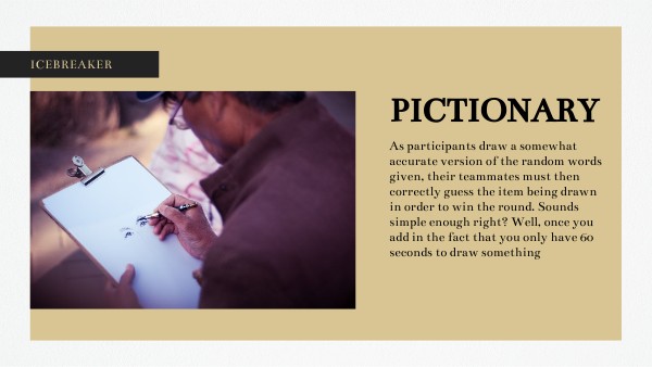 Once they see the word, they have 5 seconds to think before they begin to draw. Once they begin drawing, they have 1 minute to try to get your classmates to guess the random word. If the partner succeeds in guessing the correct word being drawn, the team gets a point, but they get zero points if they don't. The FASTEST team WINS. DOs: -Draw any and everything related to your given word. - Break down the word into syllables. - Use symbols. DON'Ts - Use numbers or symbols to draw or describe your word. - Speak to your teammates while you're playing. - Use "nose" for "smells like" or any symbols that show how many letters are in a word.