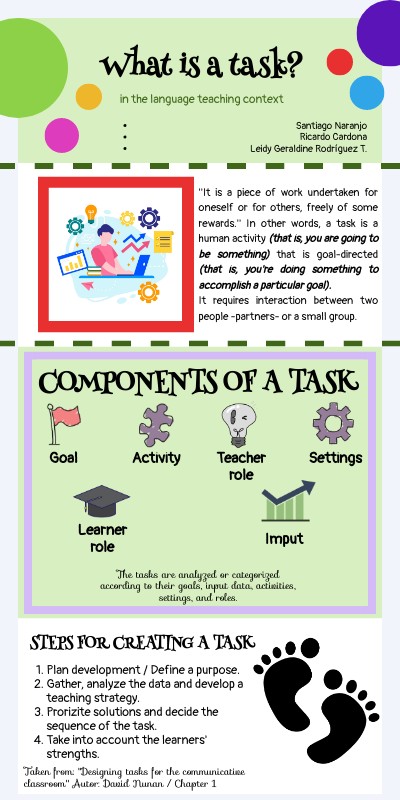 ''It is a piece of work undertaken for oneself or for others, freely of some rewards.'' In other words, a task is a human activity (that is, you are going to be something) that is goal-directed (that is, you're doing something to accomplish a particular goal). It requires interaction between two people -partners- or a small group.