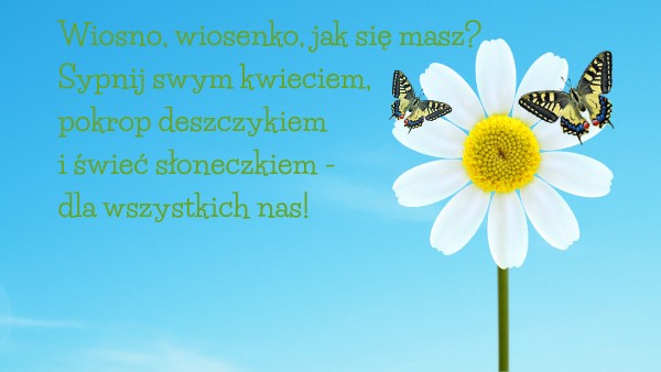 Wiosno, wiosenko, jak się masz?Sypnij swym kwieciem, pokrop deszczykiem i świeć słoneczkiem - dla wszystkich nas!