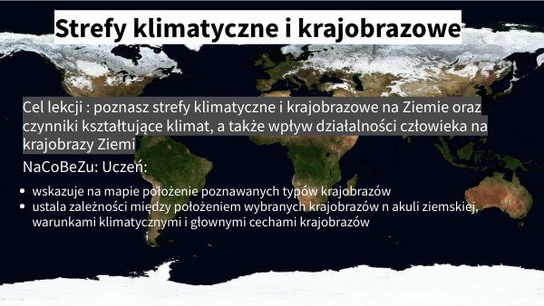 Cel lekcji : poznasz strefy klimatyczne i krajobrazowe na Ziemie oraz czynniki kształtujące klimat, a także wpływ działalności człowieka na krajobrazy Ziemi