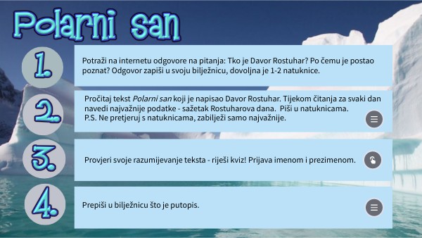 Pročitaj tekst Polarni san koji je napisao Davor Rostuhar. Tijekom čitanja za svaki dan navedi najvažnije podatke - sažetak Rostuharova dana. Piši u natuknicama.P.S. Ne pretjeruj s natuknicama, zabilježi samo najvažnije.