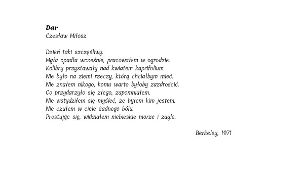 Dar Czesław Miłosz Dzień taki szczęśliwy. Mgła opadła wcześnie, pracowałem w ogrodzie. Kolibry przystawały nad kwiatem kaprifolium. Nie było na ziemi rzeczy, którą chciałbym mieć. Nie znałem nikogo, komu warto byłoby zazdrościć. Co przydarzyło się złego, zapomniałem. Nie wstydziłem się myśleć, że byłem kim jestem. Nie czułem w ciele żadnego bólu. Prostując się, widziałem niebieskie morze i żagle. Berkeley, 1971