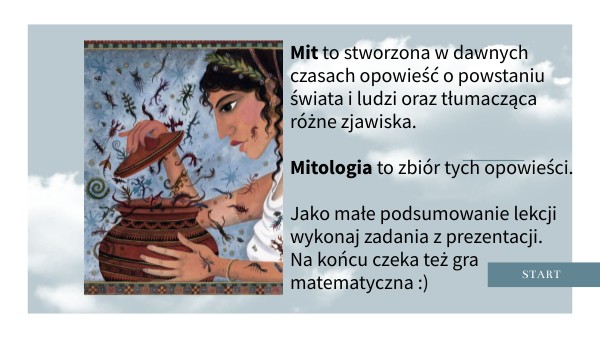 Mit to stworzona w dawnych czasach opowieść o powstaniu świata i ludzi oraz tłumacząca różne zjawiska. Mitologia to zbiór tych opowieści. Jako małe podsumowanie lekcji wykonaj zadania z prezentacji. Na końcu czeka też gra matematyczna :)