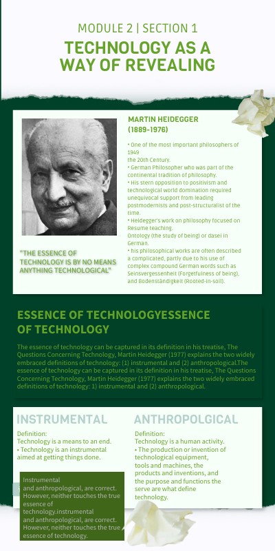 The essence of technology can be captured in its definition in his treatise, The Questions Concerning Technology, Martin Heidegger (1977) explains the two widely embraced definitions of technology: (1) instrumental and (2) anthropological.The essence of technology can be captured in its definition in his treatise, The Questions Concerning Technology, Martin Heidegger (1977) explains the two widely embraced definitions of technology: 1) instrumental and (2) anthropological.