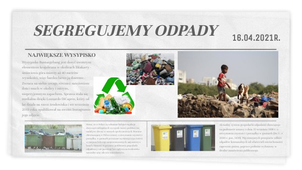 1) Co to jest recykling? 2) Jakich kolorów są pojemniki do segregowania odpadów? 3) Co to jest kompostownik? 4) Czy w Twoim otoczeniu też się segreguje śmieci?