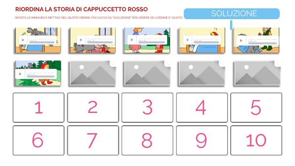 SPOSTA LE IMMAGINI E METTILE NEL GIUSTO ORDINE. POI CLICCA SU "SOLUZIONE" PER VEDERE SE L'ORDINE E' GIUSTO