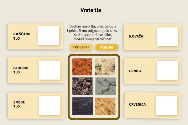 Dodirni naziv tla, pročitaj opis i pridruži mu odgovarajuću sliku. Kad rasporediš sve slike, možeš provjeriti točnost.