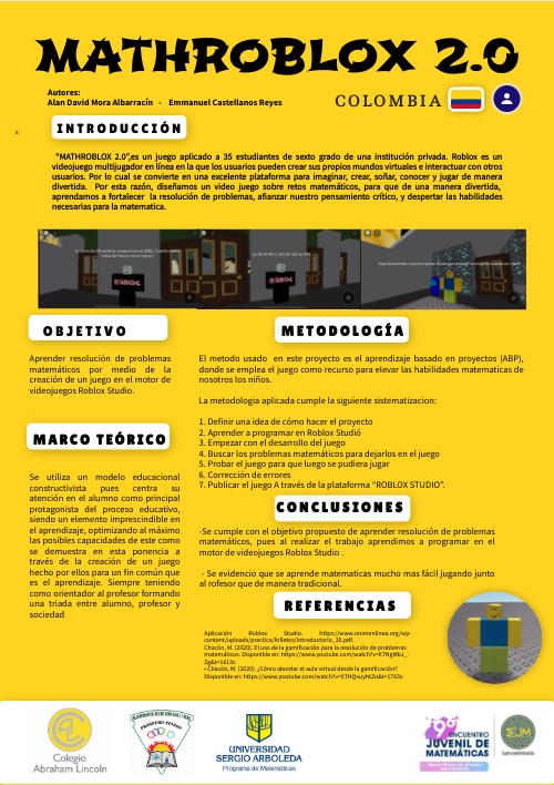 “MATHROBLOX 2.0”,es un juego aplicado a 35 estudiantes de sexto grado de una institución privada. Roblox es un videojuego multijugador en línea en la que los usuarios pueden crear sus propios mundos virtuales e interactuar con otros usuarios. Por lo cual se convierte en una excelente plataforma para imaginar, crear, soñar, conocer y jugar de manera divertida. Por esta razón, diseñamos un video juego sobre retos matemáticos, para que de una manera divertida, aprendamos a fortalecer la resolución de problemas, afianzar nuestro pensamiento crítico, y despertar las habilidades necesarias para la matematica.