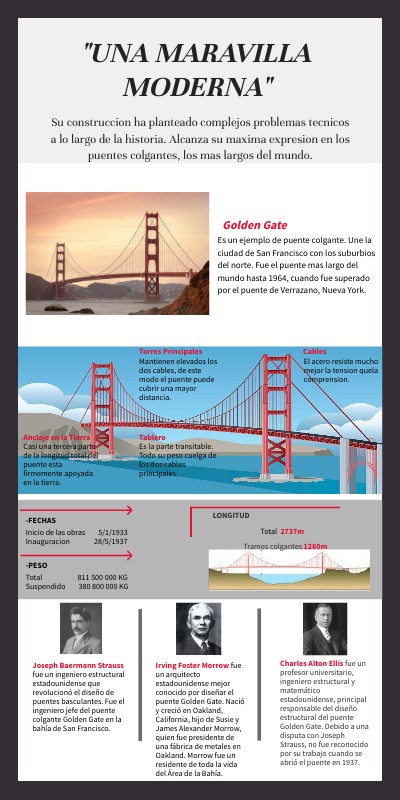 Es un ejemplo de puente colgante. Une la ciudad de San Francisco con los suburbios del norte. Fue el puente mas largo del mundo hasta 1964, cuando fue superado por el puente de Verrazano, Nueva York.