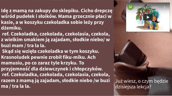 Idę z mamą na zakupy do sklepiku. Cicho drepczę wśród pudełek i słoików. Mama grzecznie płaci w kasie, a w koszyku czekoladka sobie leży przy dżemiku. ref. Czekoladka, czekolada, czekolasia, czekola, z wielkim smakiem ją zajadam, słodkie niebo/ w buzi mam / tra la la. Skąd się wzięła czekoladka w tym koszyku. Krasnoludek pewnie zrobił fiku-miku. Ach mamusiu, po co zaraz tyle krzyku. To przyjemność dla dziewczynek i chłopczyków. ref. Czekoladka, czekolada, czekolasia, czekola, razem z mamą ją zajadam, słodkie niebo /w buzi ma / tra la la.