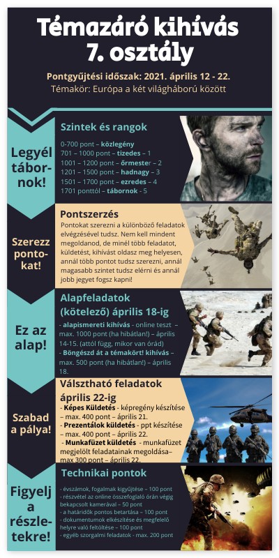 - Képes Küldetés - képregény készítése – max. 400 pont – április 21. - Prezentálok küldetés - ppt készítése – max. 400 pont – április 22. - Munkafüzet küldetés - munkafüzet megjelölt feladatainak megoldása– max 300 pont – április 22.