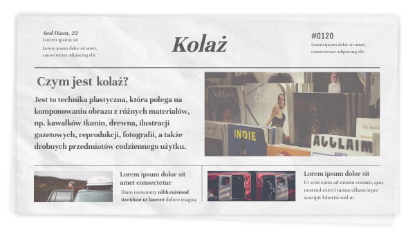 Jest to technika plastyczna, która polega na komponowaniu obrazu z różnych materiałów, np. kawałków tkanin, drewna, ilustracji gazetowych, reprodukcji, fotografii, a także drobnych przedmiotów codziennego użytku.