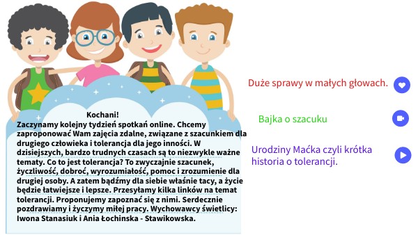 Kochani! Zaczynamy kolejny tydzień spotkań online. Chcemy zaproponować Wam zajęcia zdalne, związane z szacunkiem dla drugiego człowieka i tolerancja dla jego inności. W dzisiejszych, bardzo trudnych czasach są to niezwykle ważne tematy. Co to jest tolerancja? To zwyczajnie szacunek, życzliwość, dobroć, wyrozumiałość, pomoc i zrozumienie dla drugiej osoby. A zatem bądźmy dla siebie właśnie tacy, a życie będzie łatwiejsze i lepsze. Przesyłamy kilka linków na temat tolerancji. Proponujemy zapoznać się z nimi. Serdecznie pozdrawiamy i życzymy miłej pracy. Wychowawcy świetlicy: Iwona Stanasiuk i Ania Łochinska - Stawikowska.