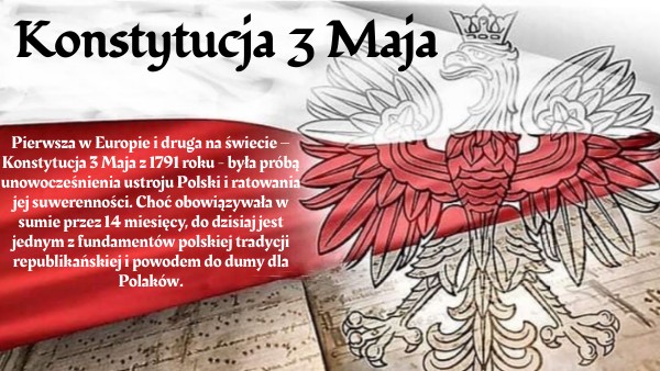 Pierwsza w Europie i druga na świecie – Konstytucja 3 Maja z 1791 roku - była próbą unowocześnienia ustroju Polski i ratowania jej suwerenności. Choć obowiązywała w sumie przez 14 miesięcy, do dzisiaj jest jednym z fundamentów polskiej tradycji republikańskiej i powodem do dumy dla Polaków.