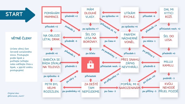 Určete větný člen červeně označeného slova. Postupujte podle šipek a počítejte (sčítejte nebo odčítejte čísla u šipek, v jejichž směru postupujete)