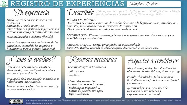 "Canvas para registrar experiencias" por CEP de Antequera y José Arjona Pérez (@leonidasarjona), se encuentra bajo una Licencia Creative Commons Reconocimiento-NoComercial-SinObraDerivada 3.0 Unported.