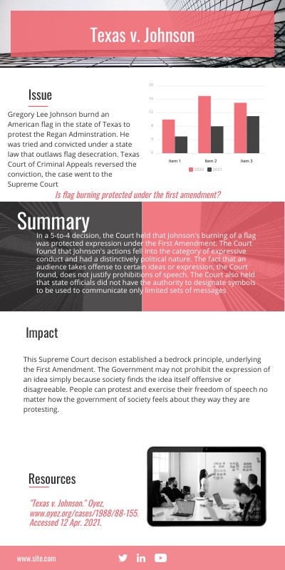 "Texas v. Johnson." Oyez, www.oyez.org/cases/1988/88-155. Accessed 12 Apr. 2021.