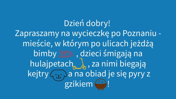 Dzień dobry! Zapraszamy na wycieczkę po Poznaniu -mieście, w którym po ulicach jeżdżą bimby , dzieci śmigają na hulajpetach , za nimi biegają kejtry a na obiad je się pyry z gzikiem !
