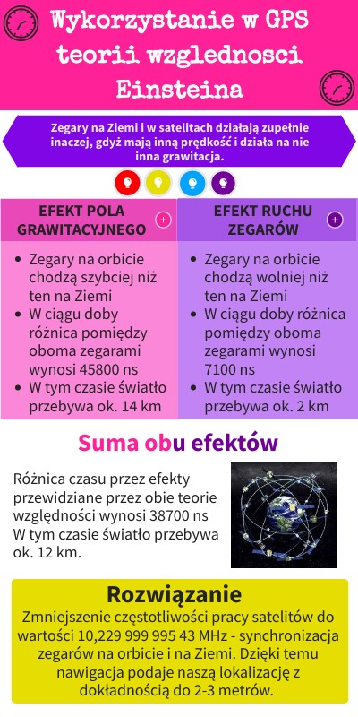 Zegary na Ziemi i w satelitach działają zupełnie inaczej, gdyż mają inną prędkość i działa na nie inna grawitacja.