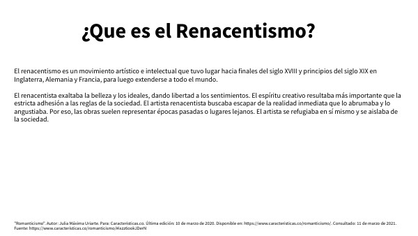 "Romanticismo". Autor: Julia Máxima Uriarte. Para: Caracteristicas.co. Última edición: 10 de marzo de 2020. Disponible en: https://www.caracteristicas.co/romanticismo/. Consultado: 11 de marzo de 2021. Fuente: https://www.caracteristicas.co/romanticismo/#ixzz6ookJDerN