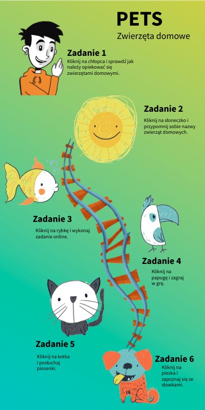 Kliknij na chłopca i sprawdź jak należy opiekować się zwierzętami domowymi.