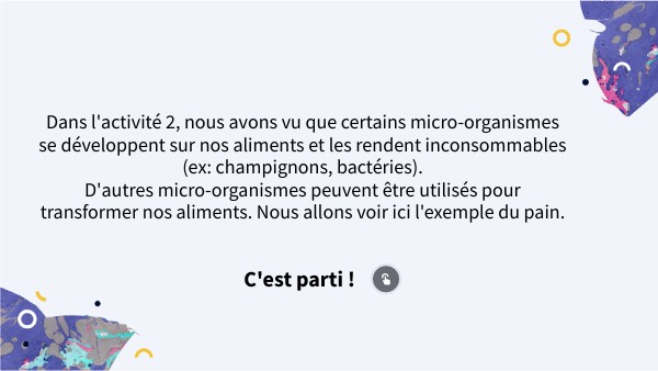 Dans l'activité 2, nous avons vu que certains micro-organismes se développent sur nos aliments et les rendent inconsommables (ex: champignons, bactéries).D'autres micro-organismes peuvent être utilisés pour transformer nos aliments. Nous allons voir ici l'exemple du pain.