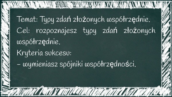 Temat: Typy zdań złożonych współrzędnie. Cel: rozpoznajesz typy zdań złożonych współrzędnie. Kryteria sukcesu: - wymieniasz spójniki współrzędności.