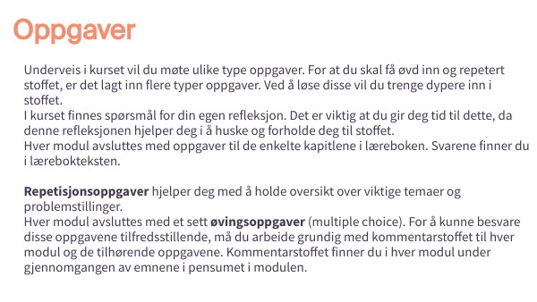 Underveis i kurset vil du møte ulike type oppgaver. For at du skal få øvd inn og repetert stoffet, er det lagt inn flere typer oppgaver. Ved å løse disse vil du trenge dypere inn i stoffet. I kurset finnes spørsmål for din egen refleksjon. Det er viktig at du gir deg tid til dette, da denne refleksjonen hjelper deg i å huske og forholde deg til stoffet. Hver modul avsluttes med oppgaver til de enkelte kapitlene i læreboken. Svarene finner du i lærebokteksten. Repetisjonsoppgaver hjelper deg med å holde oversikt over viktige temaer og problemstillinger. Hver modul avsluttes med et sett øvingsoppgaver (multiple choice). For å kunne besvare disse oppgavene tilfredsstillende, må du arbeide grundig med kommentarstoffet til hver modul og de tilhørende oppgavene. Kommentarstoffet finner du i hver modul under gjennomgangen av emnene i pensumet i modulen.
