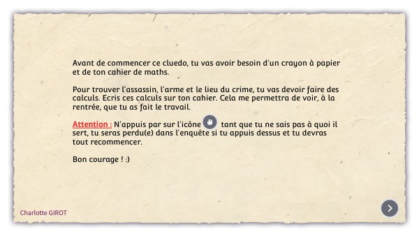 Avant de commencer ce cluedo, tu vas avoir besoin d'un crayon à papier et de ton cahier de maths. Pour trouver l'assassin, l'arme et le lieu du crime, tu vas devoir faire des calculs. Ecris ces calculs sur ton cahier. Cela me permettra de voir, à la rentrée, que tu as fait le travail. Attention : N'appuis par sur l'icône tant que tu ne sais pas à quoi il sert, tu seras perdu(e) dans l'enquête si tu appuis dessus et tu devras tout recommencer. Bon courage ! :)