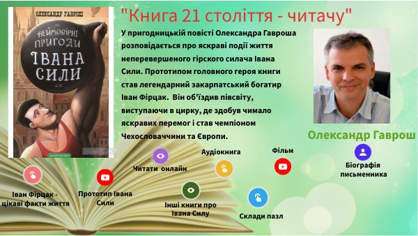 У пригодницькій повісті Олександра Гавроша розповідається про яскраві події життя неперевершеного гірського силача Івана Сили. Прототипом головного героя книги став легендарний закарпатський богатир Іван Фірцак. Він об'їздив півсвіту, виступаючи в цирку, де здобув чимало яскравих перемог і став чемпіоном Чехословаччини та Європи.