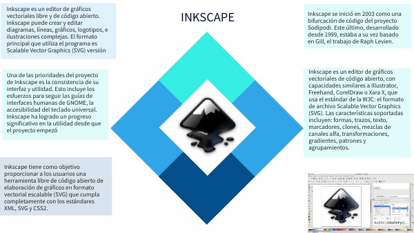 Inkscape es un editor de gráficos vectoriales libre y de código abierto. Inkscape puede crear y editar diagramas, líneas, gráficos, logotipos, e ilustraciones complejas. El formato principal que utiliza el programa es Scalable Vector Graphics (SVG) versión
