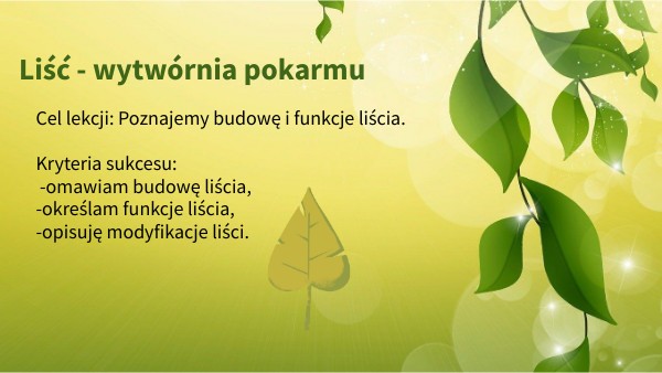 Cel lekcji: Poznajemy budowę i funkcje liścia. Kryteria sukcesu: -omawiam budowę liścia, -określam funkcje liścia, -opisuję modyfikacje liści.