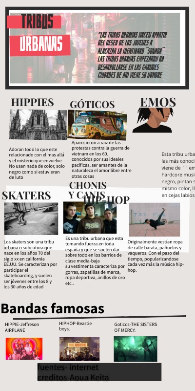 "Las tribus urbanas nacen apartir del deseo de los jovenes a alacnzar la identidaad ´´soñada´´ las tribus urbanas empezaron ha desarrollarse en las grandes ciudades de ahi viene su nombre