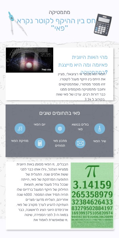הפאי הוא מספר אי רציונאלי, מציין את היחס בין היקף מעגל לקוטרו. זהו מספר מסתורי, שמתמטיקאים וחובבי מתמטיקה מוקסמים ממנו כבר דורות רבים. ערכו של פאי שווה בקירוב ל 3.14.