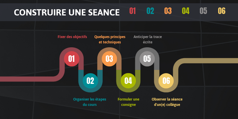 Je vous conseille de vous fixer, pour chaque séance, un objectif principal, simple et réaliste, ainsi qu’un ou deux objectifs secondaires. De ces objectifs découleront les différentes étapes du cours. Le schéma présenté ci-dessous est un modèle-type qu’il convient d’adapter en fonction de la place de la séance dans la séquence.