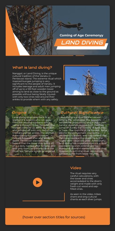 The ritual requires very careful calculations, with the tower and vines accomedated to the diver's weight and made with only fresh-cut wood and sap-filled vines. As seen in the video, tribes chant and sing cultural chants as each diver jumps.