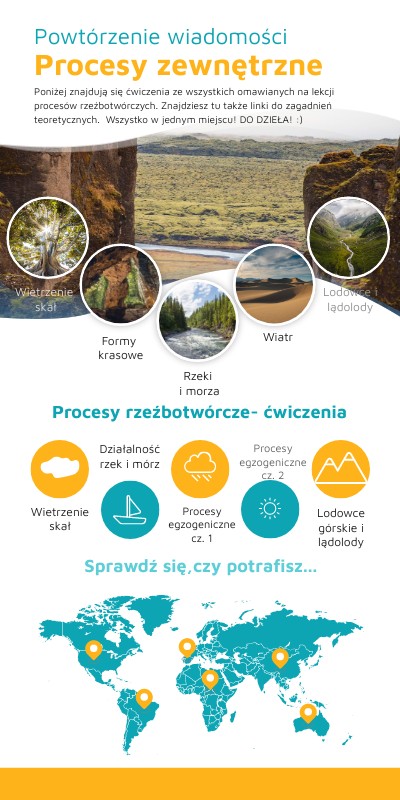 Poniżej znajdują się ćwiczenia ze wszystkich omawianych na lekcji procesów rzeźbotwórczych. Znajdziesz tu także linki do zagadnień teoretycznych. Wszystko w jednym miejscu! DO DZIEŁA! :)