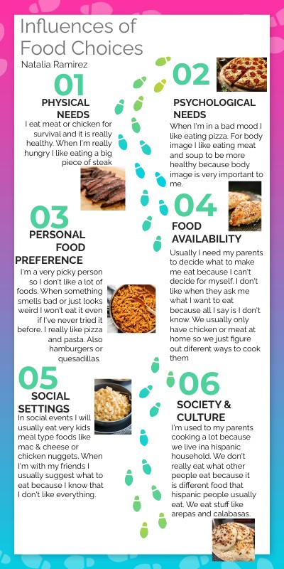 When I'm in a bad mood I like eating pizza. For body image I like eating meat and soup to be more healthy because body image is very important to me.