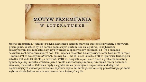Motyw przemijania. "Vanitas" z języka łacińskiego oznacza marność i jest ściśle związany z motywem przemijania. W sztuce był on bardzo popularnym nurtem. Nie da się ukryć, iż najbardziej zafascynowani byli nim artyści żyjący i tworzący w epoce wieków średnich( od 476 r (upadek cesarstwa zachodniorzymskiego) do (1453 – upadek cesarstwa bizantyjskiego,) oraz baroku(W Europie – koniec XVI w. do schyłku XVII w./1. połowy XVIII w/ W Polsce lata 30. XVII w. (pierwsze tendencje u schyłku XVI w do lat 30./40., a nawet 60. XVIII w). Borykali się oni na co dzień z problemami natury egzystencjalnej i niejako strachem przed rychło nadchodzącą śmiercią.Przemijają rzeczy doczesne, ziemskie, materialne. Człowiek nigdy nie godził się na przemijanie, zapomnienia, dlatego od najdawniejszych czasów próbował mu zapobiec czy to mumifikując zwłoki, czy pozostawiając po sobie wybitne dzieła.Jednak zmiana nie zawsze musi kojarzyć się źle.