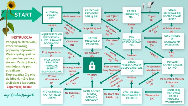 Podążaj za strzałkami, które wskazują popawną odpowiedź. Wykorzystaj rysik w górnym, lewym rogu ekranu. Zapisuj literki, znajdujące się pod strzałkami. Doprowadzą Cię one do kłódki, która jest wyjściem z labiryntu. Zapamiętaj hasło!