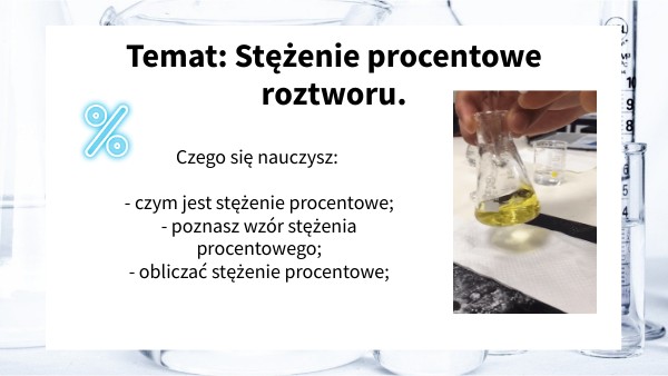 Czego się nauczysz: - czym jest stężenie procentowe; - poznasz wzór stężenia procentowego; - obliczać stężenie procentowe;