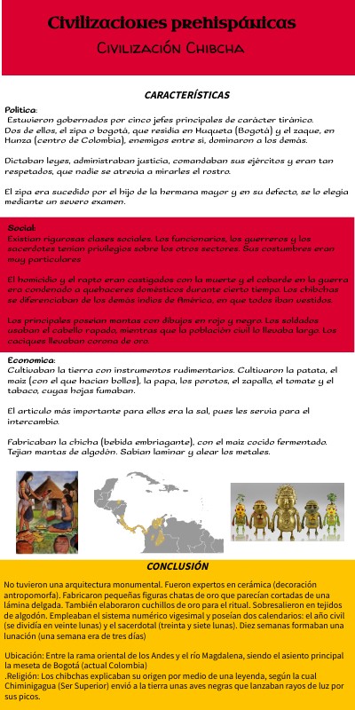 Politica: Estuvieron gobernados por cinco jefes principales de carácter tiránico. Dos de ellos, el zipa o bogotá, que residía en Muqueta (Bogotá) y el zaque, en Hunza (centro de Colombia), enemigos entre sí, dominaron a los demás. Dictaban leyes, administraban justicia, comandaban sus ejércitos y eran tan respetados, que nadie se atrevía a mirarles el rostro. El zipa era sucedido por el hijo de la hermana mayor y en su defecto, se lo elegía mediante un severo examen.